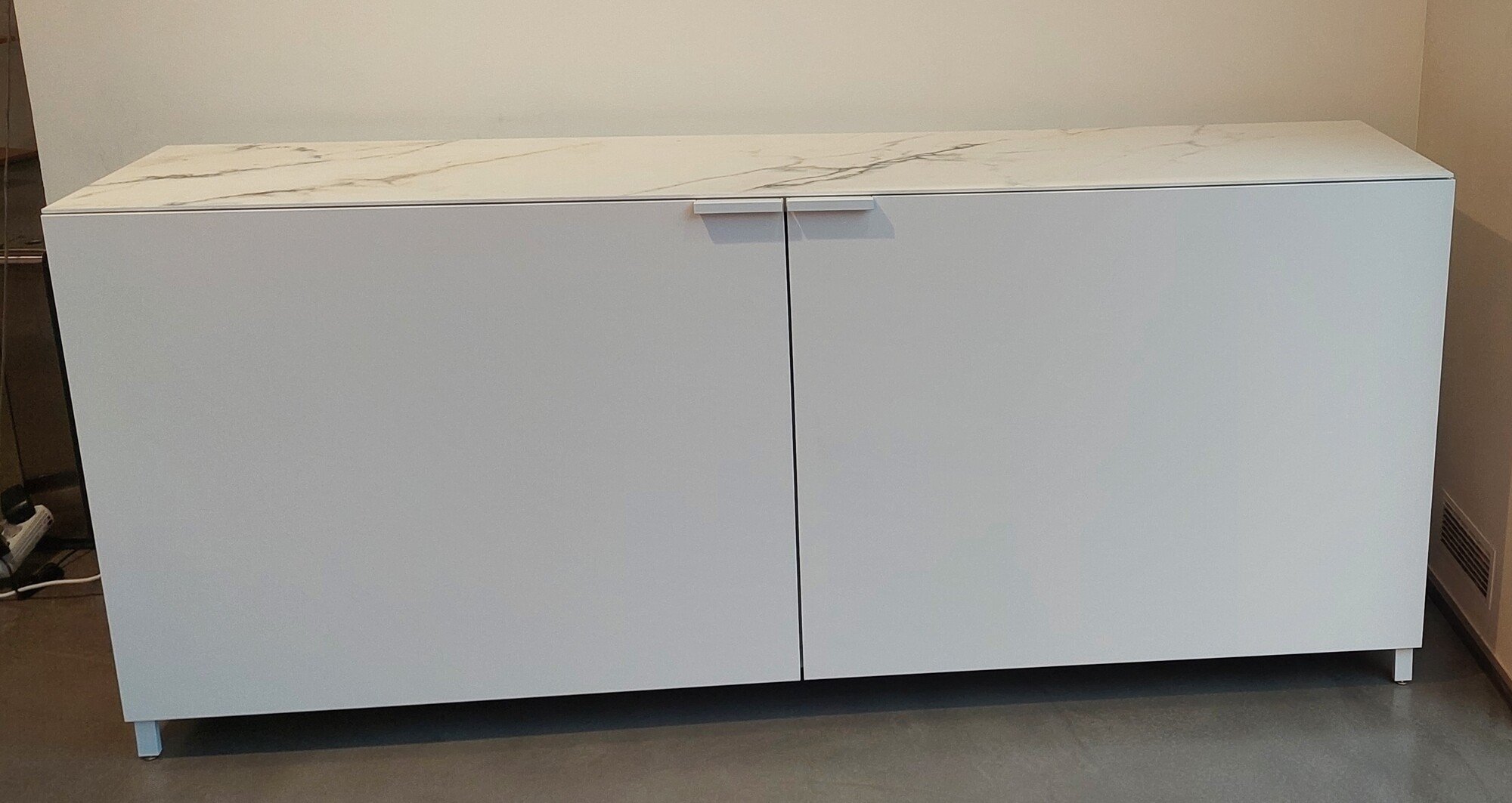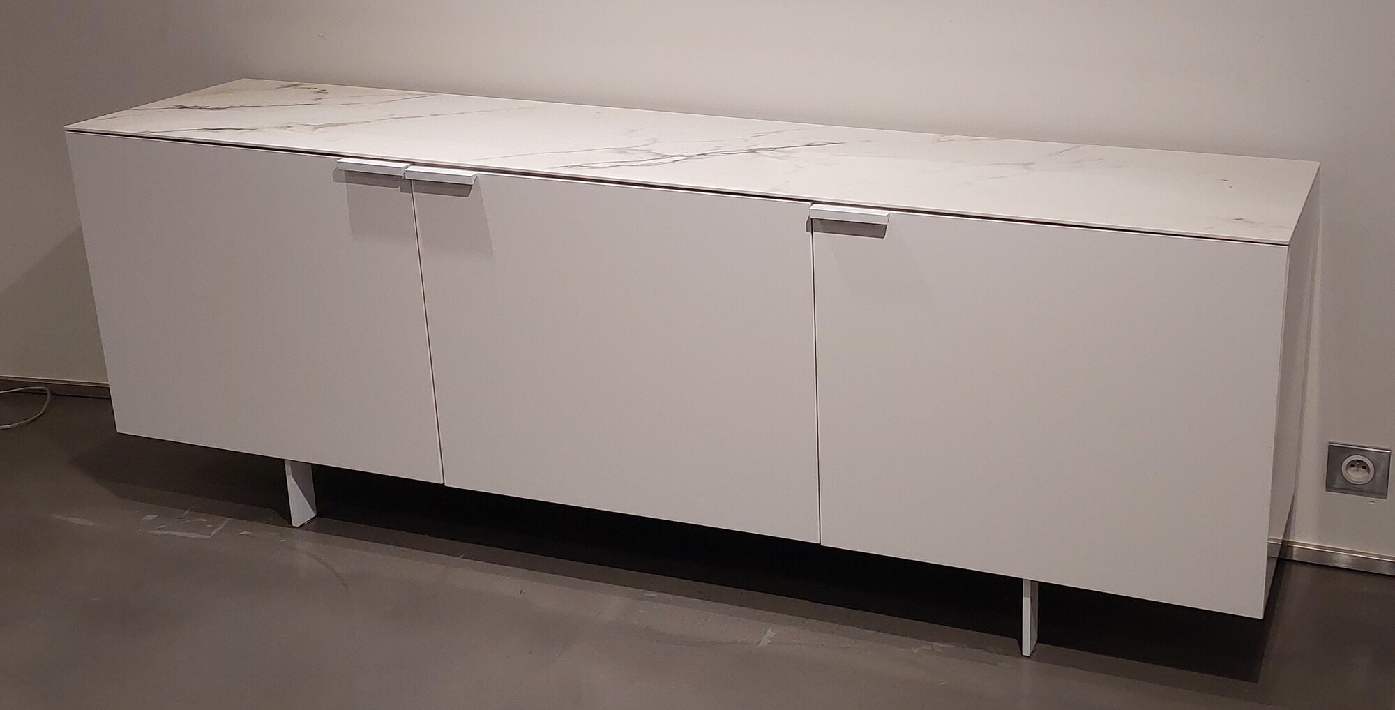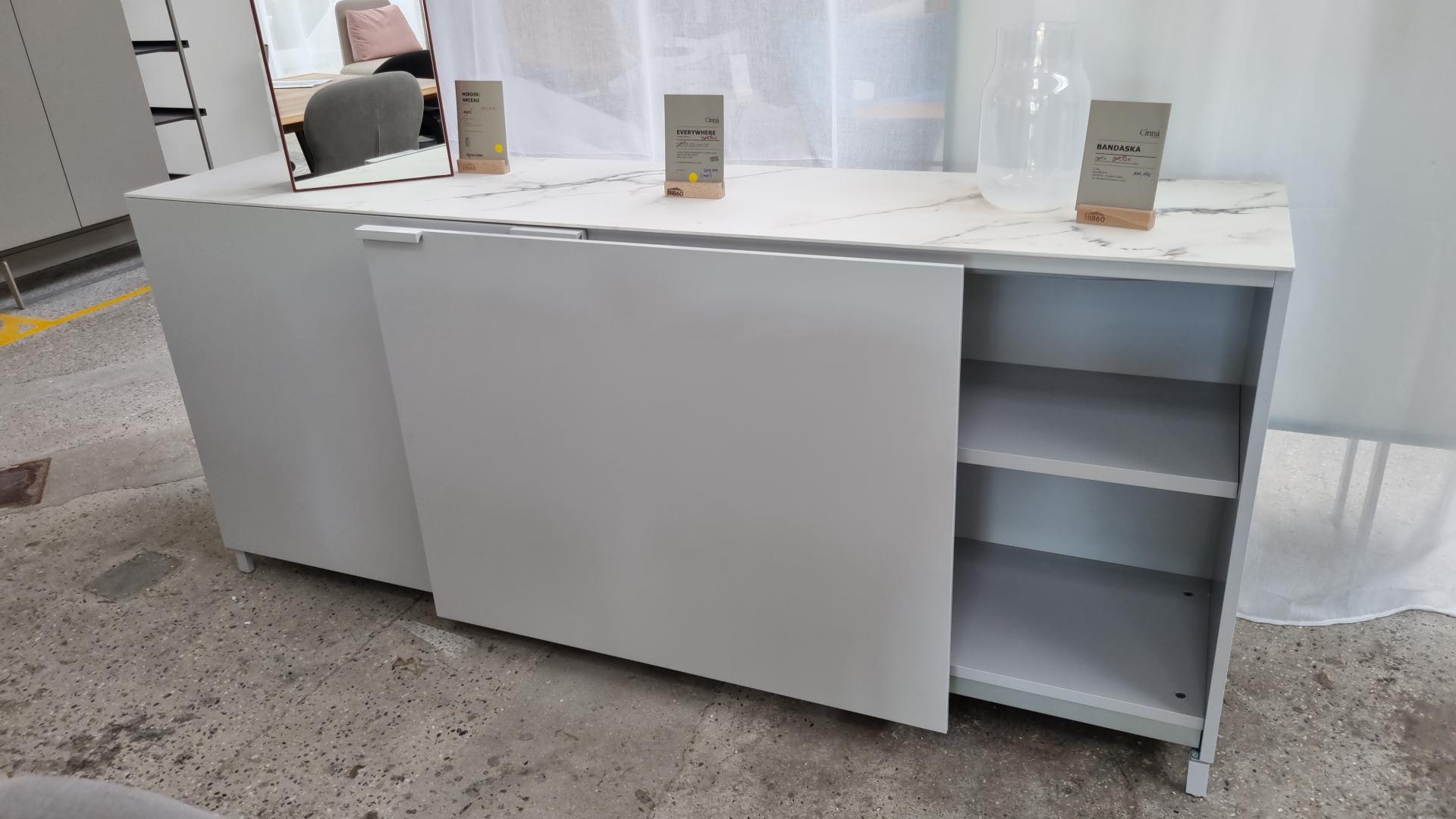 • Issu du programme de meubles Everywhere, ce bahut reflète parfaitement l'intention de son designer Christian Werner : pouvoir équiper toutes les pièces de la maison. Malgré son mètre quatre-vingt-seize de longueur, le mécanisme de portes coplanaires permet un gain de place non négligeable, pouvant se placer beaucoup plus facilement que ses congénères aux portes battantes. Le modèle que nous proposons aujourd’hui est la version laquée blanc satinée avec un top en grès cérame aspect marbre blanc, de quoi se fondre quasiment partout. Structure et finition : Laque blanc satiné et top grès cérame aspect marbre blanc. Dimensions : Hauteur 84.8 cm – Largeur 196.3 cm – Profondeur44 cm ; Poids 122,5 kg Prix avant remise 4239€ (4216€60 + 22€40 d'éco-part). Hors frais de livraison
