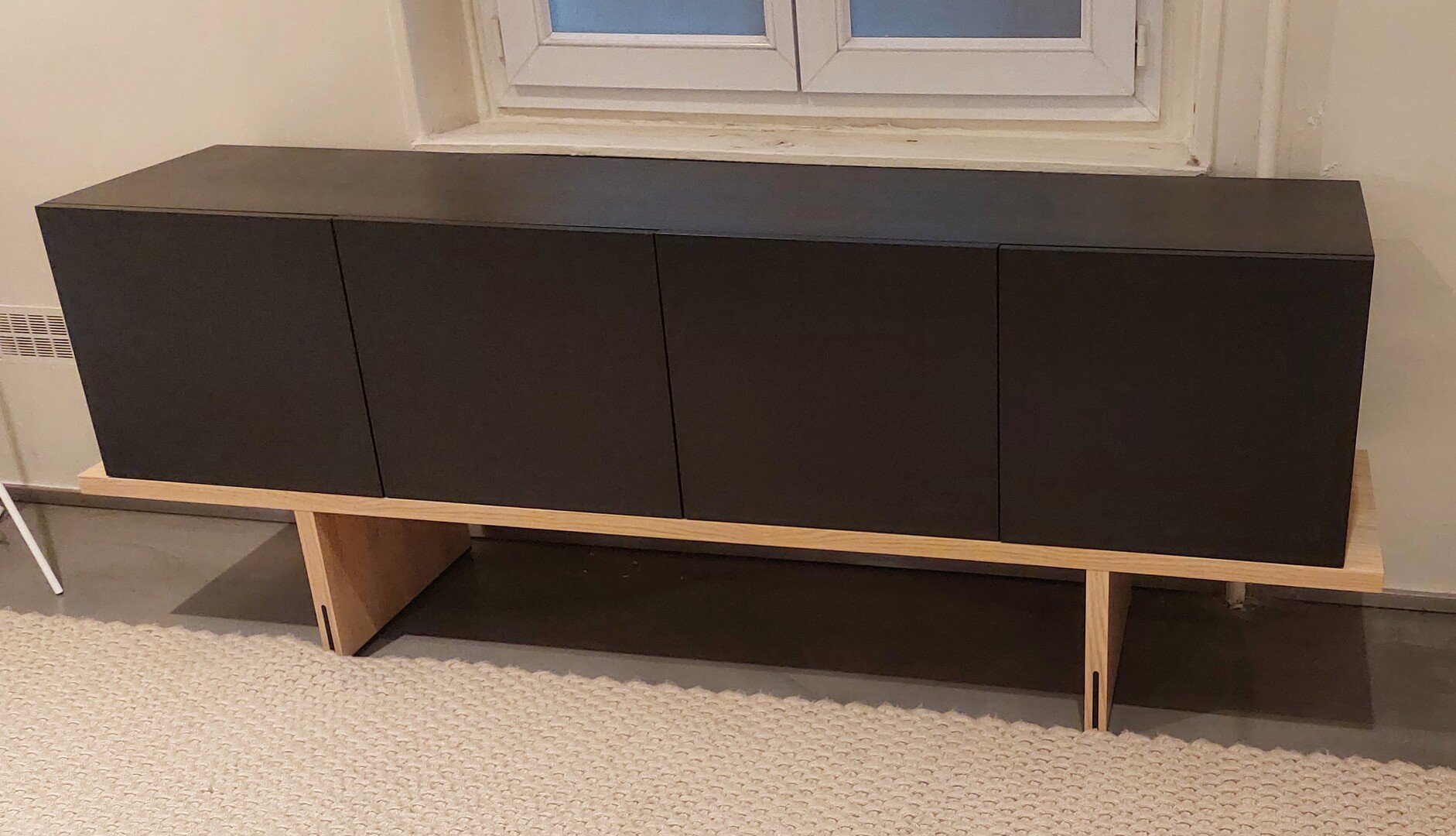 • Eric Jourdan : ''Le programme Karuma s’inscrit dans un désir de se rapprocher d’une écriture économe construite autour d’un travail sur les proportions et d’un choix de matières très pures. On peut ici se sentir proche de l’architecture japonaise ou du mobilier de Jean Michel Frank. Les superpositions et les décrochements remplacent les détails d’ébénisterie, l’acier brut se substitue à des essences de bois sophistiquées. La simplicité formelle de l’ensemble est un signe, un manifeste nous appelant à aller à l’essentiel.'' Le piétement est en panneau de particules plaqué chêne blanchi, vernis naturel. Le coffre et les 4 portes sont en placage teinté noir vernis transparent. Pas de poignée, système pousse-lâche. Dimensions : H70cm - Largeur 190cm -Profondeur 40cm. Poids : 81kg Les dimensions utiles derrière chaque porte latérale (droite et gauche) sont de L 43 cm - P 37 cm avec 1 tablette à mi-hauteur = H utile 17,7 cm. Les dimensions utiles derrière les 2 portes centrales sont de L 86 cm - P 37 cm avec 1 tablette à mi-hauteur = H utile 17,7 cm. Prix avant remise 2899€ (2892 € + 7€ d'éco-part). Hors frais de livraison