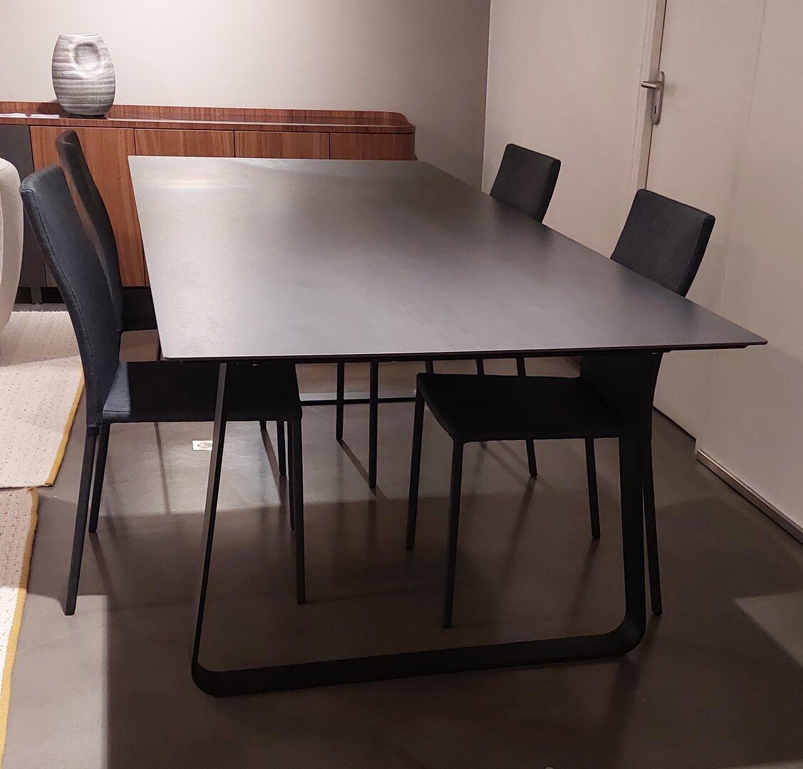 • Table de repas extrêmement épurée constitué d'un plateau relié au piétement par l'intermédiaire d'une structure de forte section comportant une platine recevant les pieds. Ce plateau, qui dépasse de 12 cm environ, rend la structure très peu visible. Les créateurs présentent Vilna comme une table novatrice, un objet de design, avec son plateau débordant et son piètement métallique affuté. PLATEAUX BOIS : en noyer européen massif verni mat ou en chêne massif naturel, épaisseur 40 mm, avec chants profilés. Plateau en grès cérame anthracite métal pleine masse épaisseur 6 mm, collé sur un panneau en MDF noir (épaisseur 12 mm) légèrement en retrait (25 mm), vissé sur une structure acier en retrait de 7 cm par rapport au bord du plateau. Cette table peut accueillir 8 couverts. Dimensions : Hauteur74cm - Largeur 240cm -Profondeur 99.4cm. Poids : 144kg Prix avant remise 3526€ (3489€ + 37€38 d'éco-part). Hors frais de livraison.