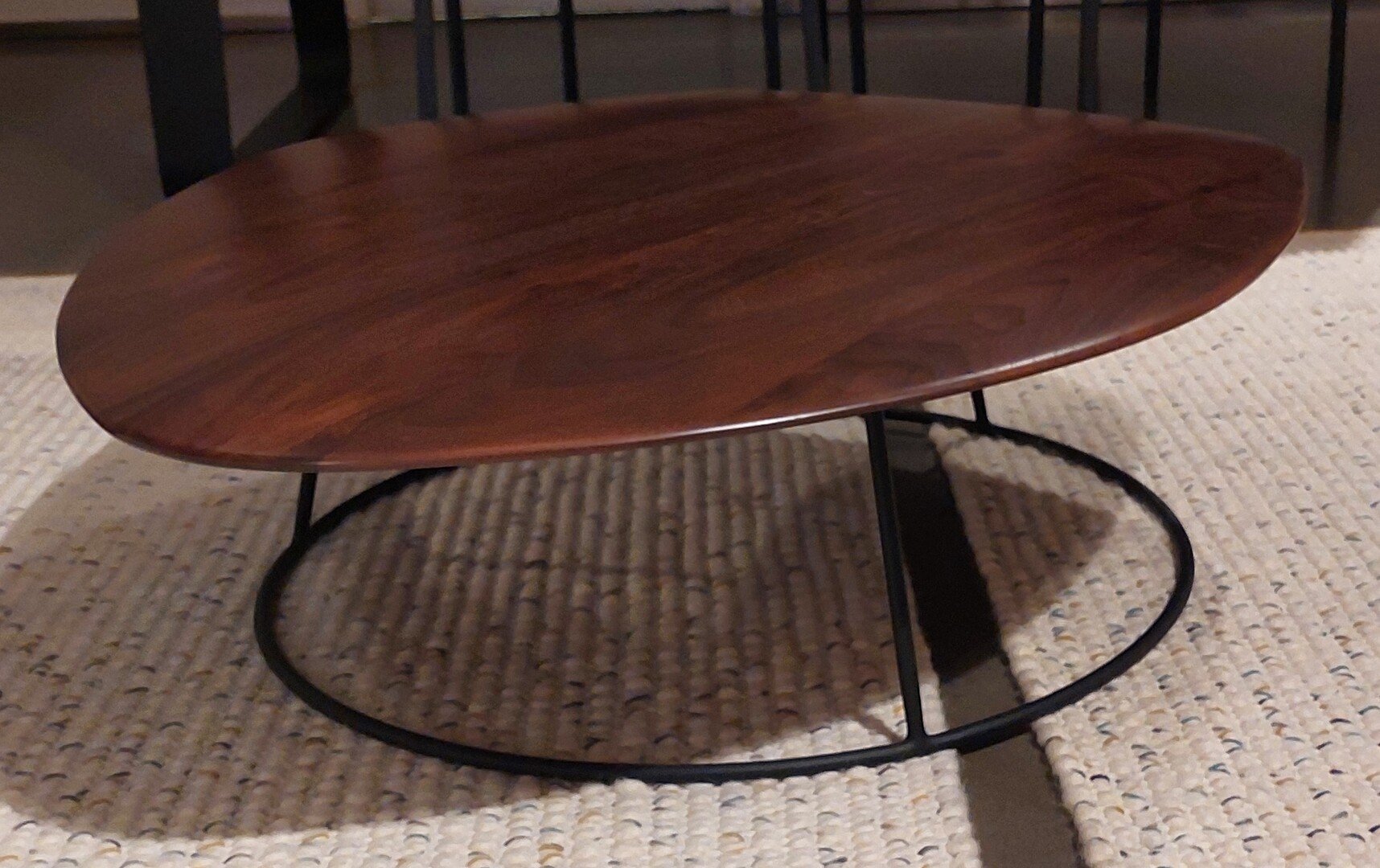 • Tables basses composées d'un plateau en noyer massif américain et d'un piétement en tube d'acier laqué noir mat. Ces tables sont vendues séparément, elles sont toutefois conçues pour pouvoir être combinées, le plateau de la table convexe passant par dessus le plateau de la table concave. Dimensions et poids : Hauteur 200 mm Largeur 1 000 mm Longueur 1 100 mm Poids 22 kg Retour de magasin