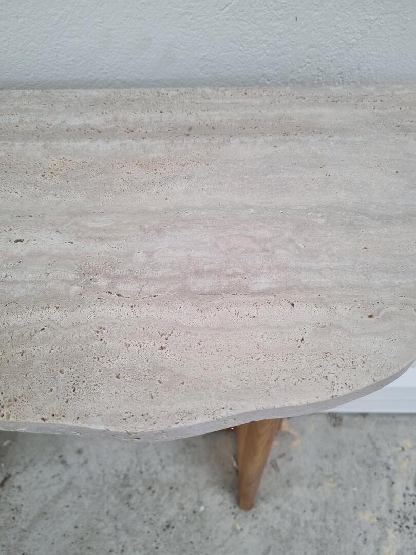 En référence à la mythologie grecque, Rhéa est la personnification des forces naturelles, déesse de la terre et des animaux, on la représentait vivant au fond des bois, sur les montagnes. Rhéa dessine une poétique inspirée du végétal, de la nature. Elle allie deux matériaux : le piétement en bois massif et le plateau en travertin. La structure des pieds est conçue en chêne avec un vernis naturel. Le plateau est en travertin à pores ouverts, avec 2 couches d’imperméabilisant, le chant du plateau reste brut (non poli). Le plateau en travertin (roche calcaire) présente de petites cavités, il permet d’avoir une texture au touché, un coté grainé et irrégulier. Sa couleur reflète la lumière. Le travertin est récupéré et retaillé pour offrir la forme d’une feuille. Il est recouvert de 2 couches d’imperméabilisant, chant brut (non poli), vérins réglables. La structure est équipée d’un système d’accroche pour fixer la console au mur. Le marbre (ou Travertin) est particulièrement sensible aux acides (vinaigre, citron), aux liquides qui en contiennent (vin, jus de fruit, colas) et aux liquides colorés (café, tomate, betterave rouge). Nous appliquons un traitement qui retarde la pénétration, mais la règle est d’essuyer immédiatement les tâches sans attendre. Il suffit de laver à l’eau tiède diluée avec un détergent doux, ne contenant pas de particules abrasives. Le traitement doit être renouveler régulièrement, un fois par an minimum.