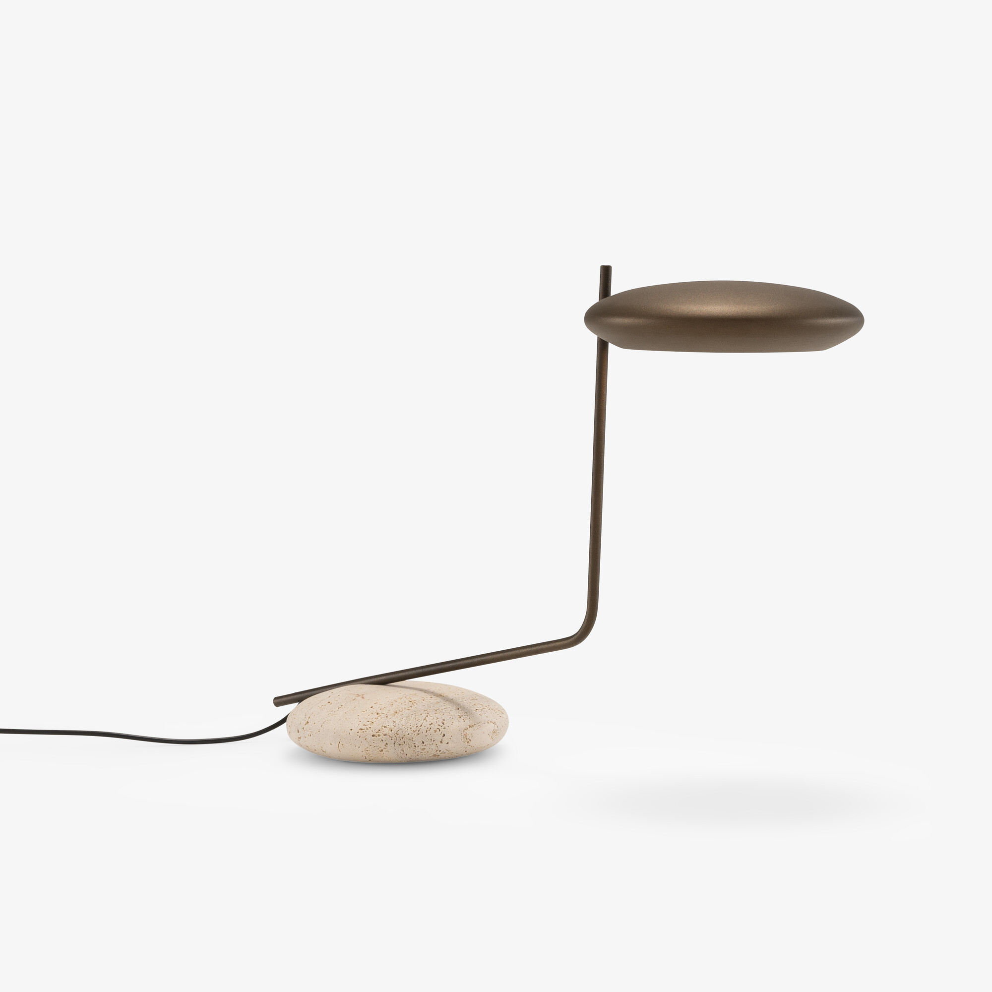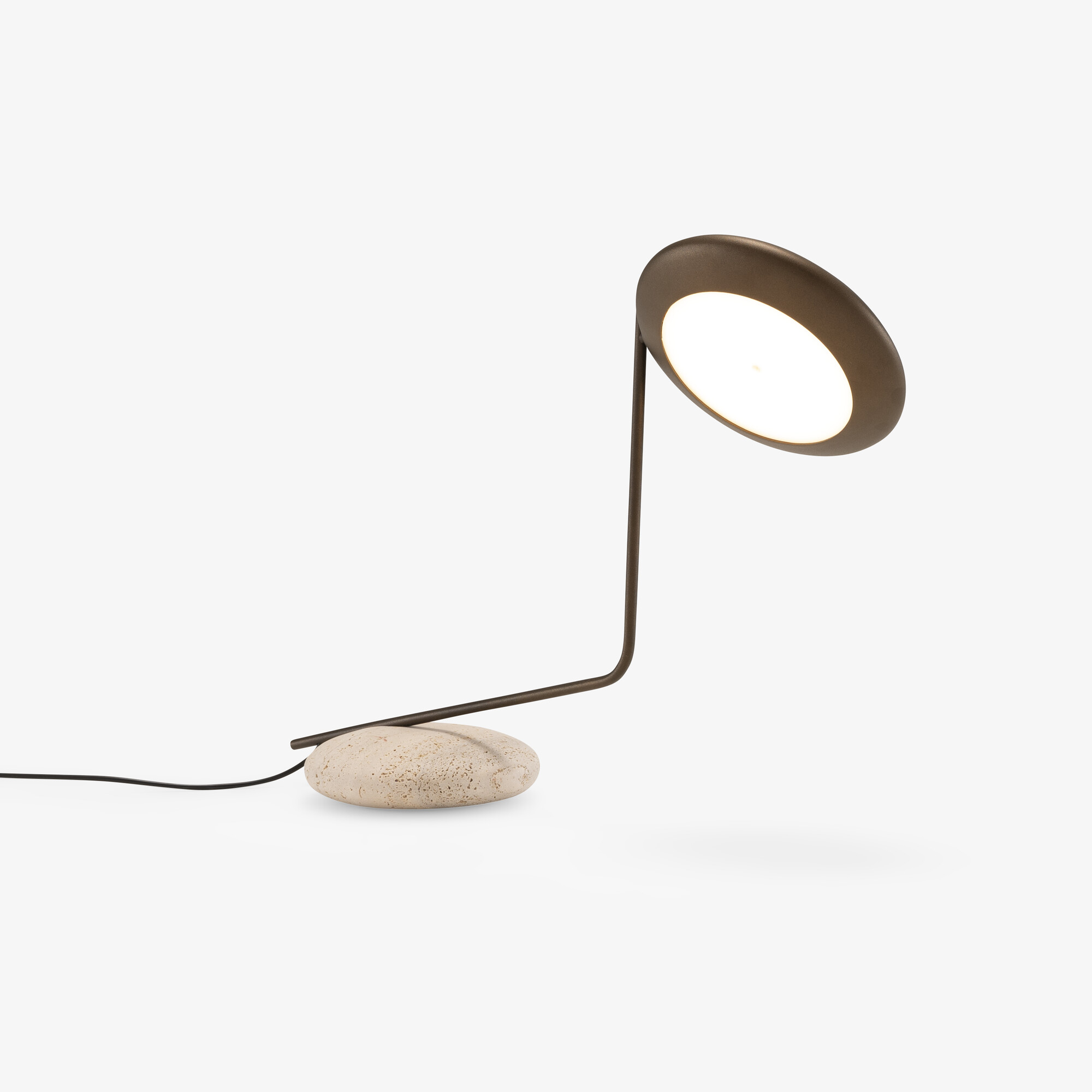 Tilda a été conçue comme une lampe de bureau originale avec une forme florale abstraite. L'objet est composé d'une pierre de travertin comme base, d'un tube incurvé et d'un abat-jour en métal qui semble flotter. Les deux corps ellipsoïdaux semblent n'être touchés que par l'élément de liaison. Un jeu sur le filigrane et le poids. Base en travertin pores ouvert + traitement hydrofuge, usiné en forme de galet (ø 21 cm H 5.8 cm). Mat et abat-jour en acier laqué Epoxy dark bronze satiné. Câble électrique PVC noir. Interrupteur/variateur à main noir. Module LED 13 W dégageant 2190 Lumen. Température de couleur 3000 K (blanc chaud). Luminaire à LED interchangeables. Alimentation LED 100-240V 350 mA 13 W multiplug livrée avec une fiche Euro et un fiche US interchangeable. Consommation totale (module LED + alimentation) : 13.8 W. Consommation résiduelle lorsque la lampe à poser est éteinte : 0.5 W.