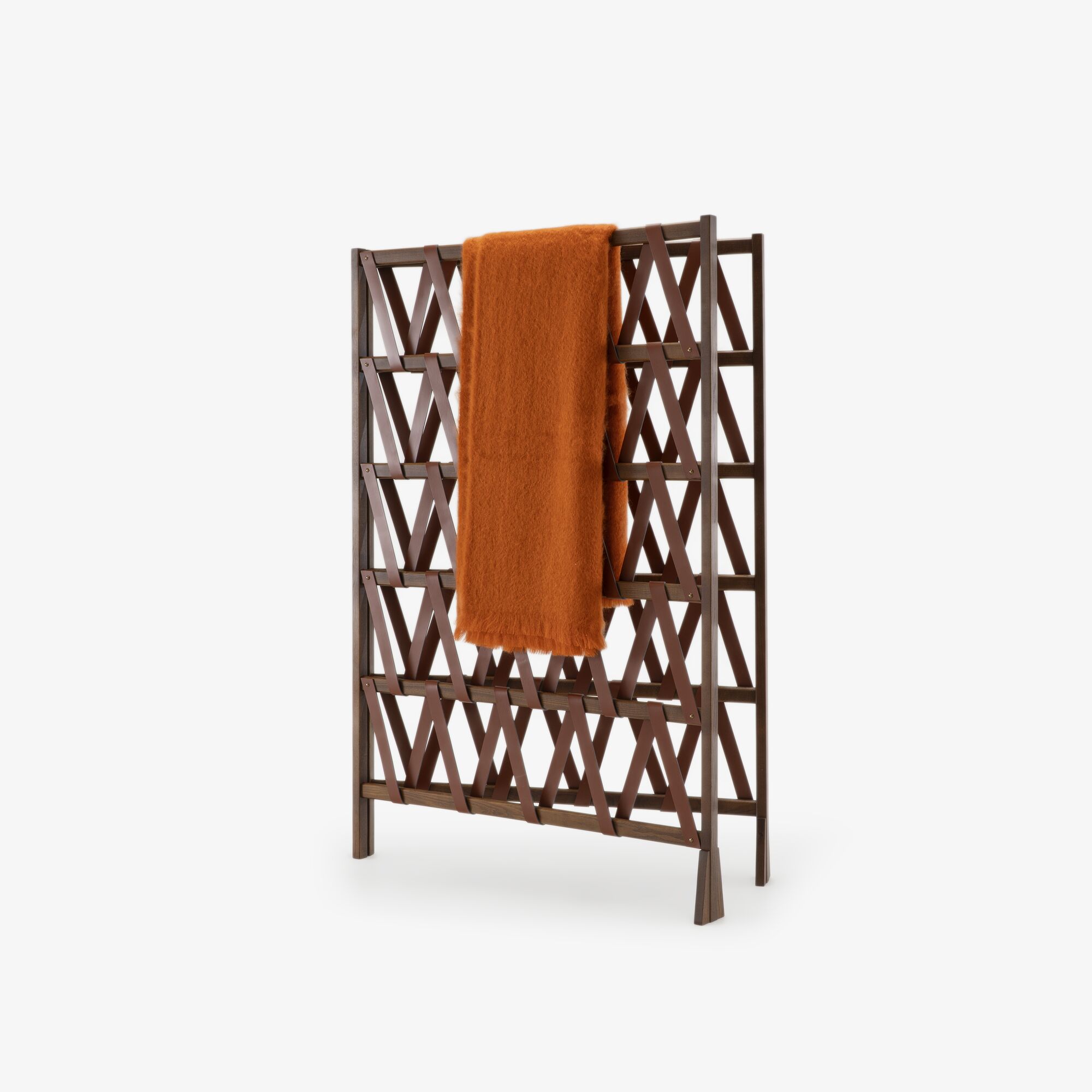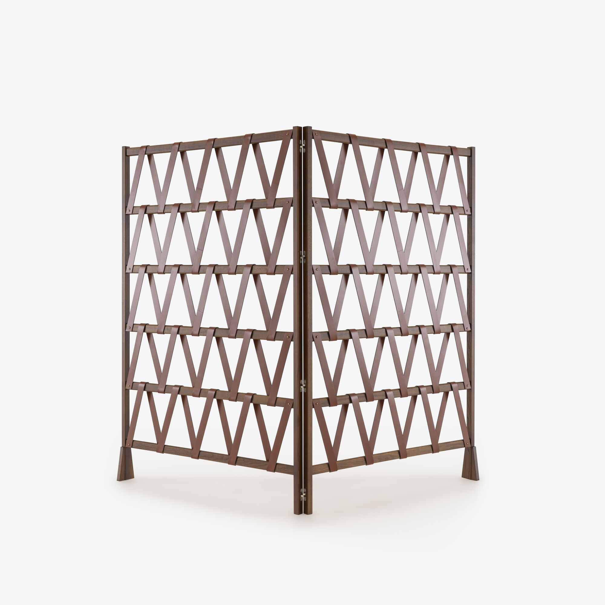 Telle une partition de musique où lignes et notes forment un graphisme dynamique, Partition est un paravent aéré, mais bien présent. On le place derrière un sofa ou en écran léger pour protéger, séparer des espaces, et apporter chaleur et intimité. Une mise en œuvre graphique sophistiquée de synderme et de bois. La double armature de Partition en frêne massif teinté noyer offre une robustesse et une élégance intemporelles. Le synderme brun est découpé, assemblé recto-verso et fixé à la structure avec un entrelacement régulier, par des artisans spécialistes de la maroquinerie haut de gamme, évoquant les lignes et les notes des partitions musicales. Le piétement en forme de T assure une stabilité optimale tout en ajoutant une note de modernité au design. Le paravent Partition est une pièce artisanale qui allie fonctionnalité et esthétique. 2 pans de 98.6 cm / H 149 cm reliés par des charnières / épaisseur 3 cm. Structure en frêne massif teinté noyer, tressage synderme coloris brun cuivre.