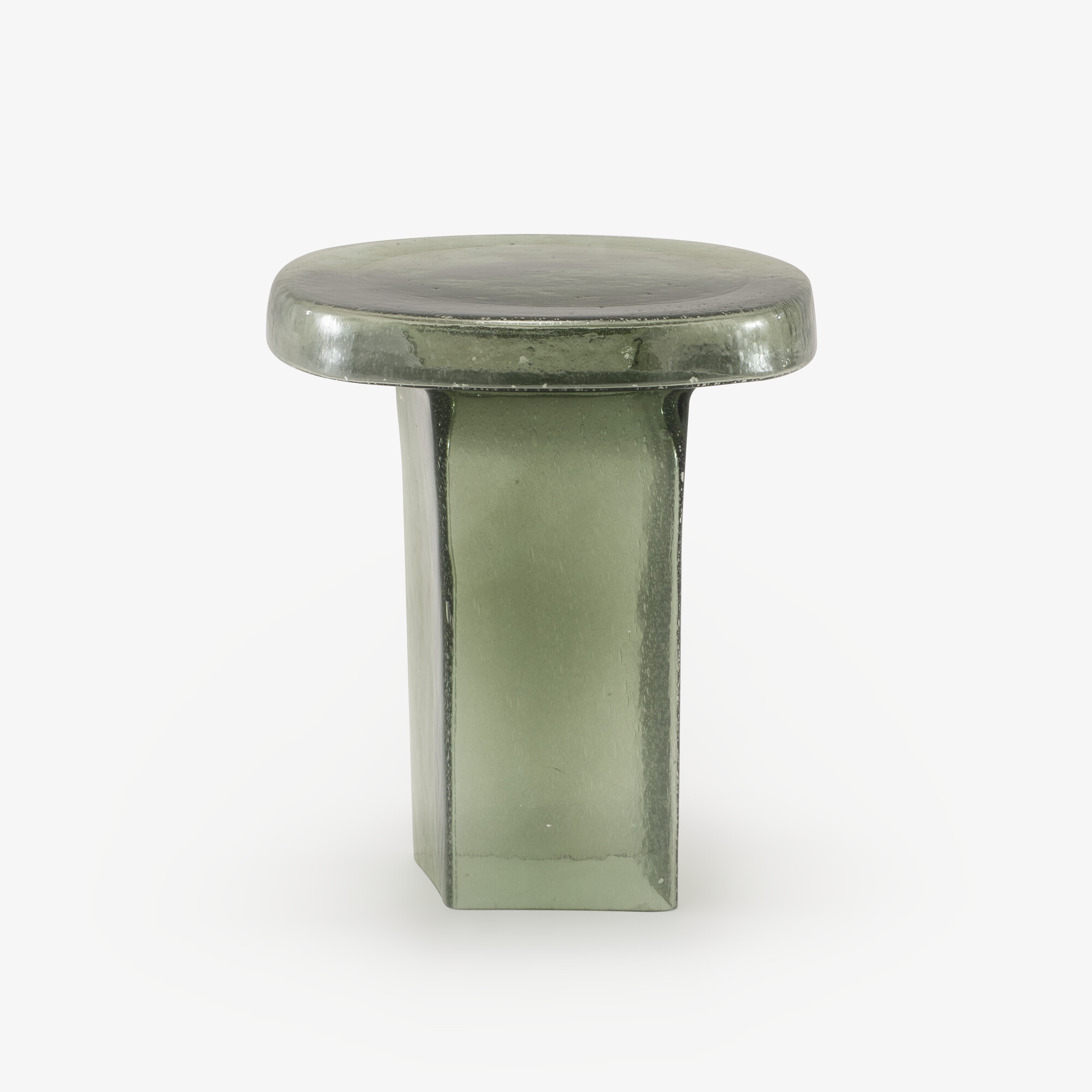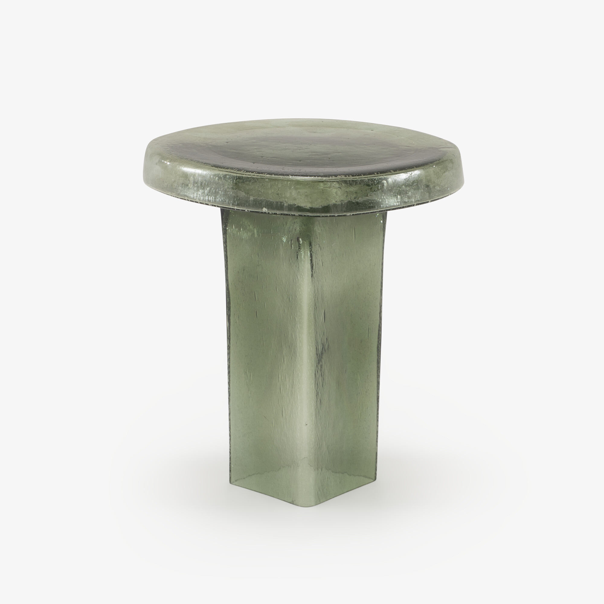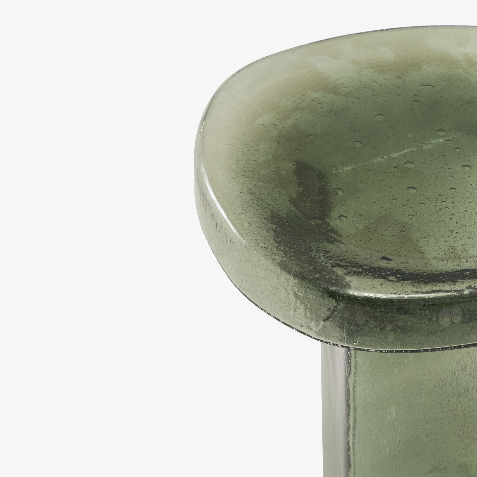 Sucre est une table d’appoint qui célèbre la poésie du verre soufflé. Sculptée d’un seul souffle, elle révèle un plateau aux contours organiques, marqué de fines bulles figés dans la matière. Son pied en losange, précis et structuré, contraste avec la forme de la surface délicatement irrégulière, affirmant un équilibre entre maîtrise et spontanéité. Une pièce innovante qui évoque la poésie du verre en mouvement, figé dans sa plus belle imperfection. Table d’appoint verre bullé, soufflé bouche, teinté dans la masse, coloris vert sauge.