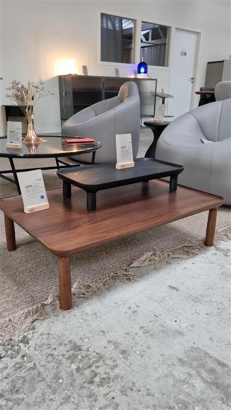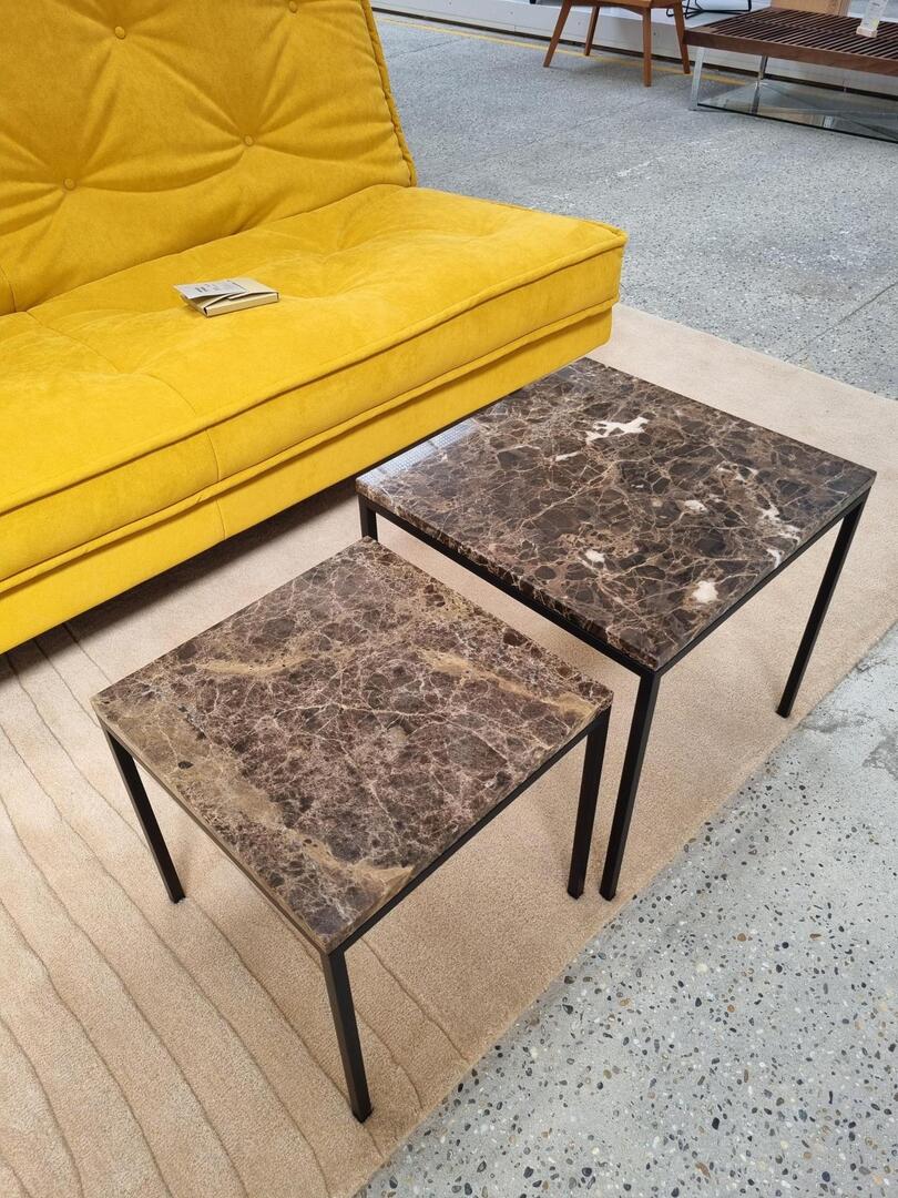 Tables basses composées d'un plateau en noyer massif américain et d'un piétement en tube d'acier laqué noir mat.