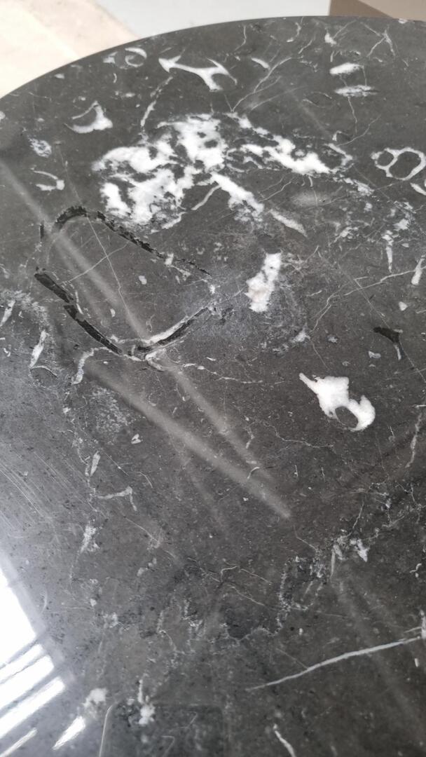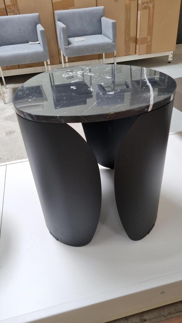 Table d'appoint composée d'un plateau et d'un mât en acier laqué coloris laiton traité antitache et d'une base en marbre noir (marquina).